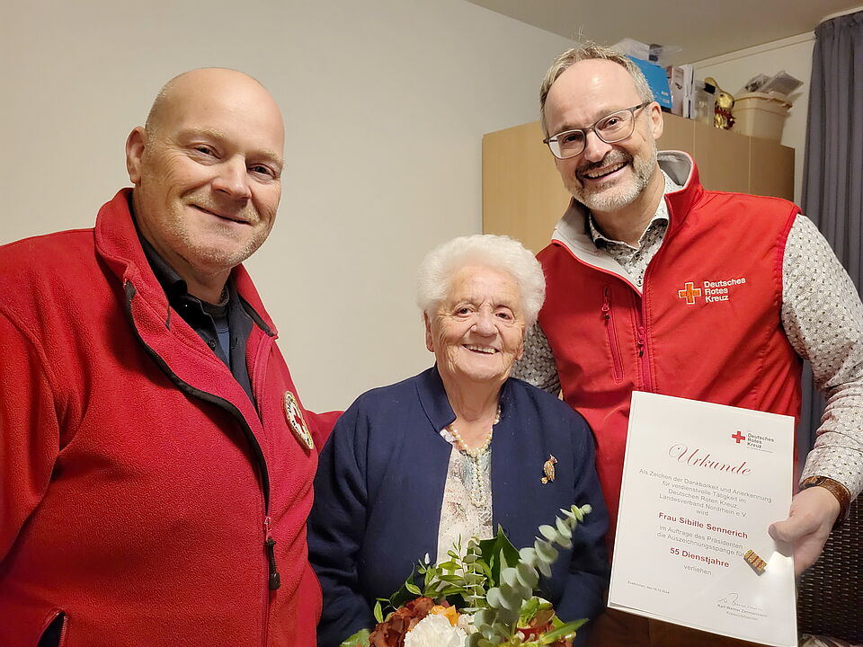 Das Trio hatte Urkunde, Verdienstnadel und einen dicken Strauß Blumen im Gepäck, um sie der einstigen Blutspende-Beauftragten und Vorstandsfrau für 55 Jahre aktive Mitarbeit im Roten Kreuz am Bleiberg zu überreichen. Herzlich nahm Sibille Sennerich Rolf Klöcker und Sascha Suijkerland in ihre Arme, während Manni Lang den Auslöser der Kamera bediente, um den rührenden Augenblick festzuhalten.
