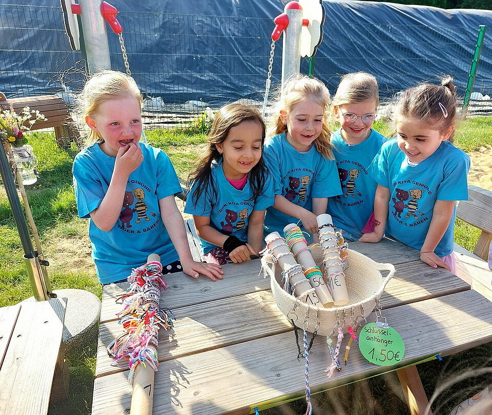 Schleiden-Olef/Gemünd – „Armbänder knüpfen für den guten Zweck“ hieß die jüngste wohltätige Aktion des DRK Familienzentrums Gemünd II. Dabei knüpften die Kita-Kinder tagelang verschiedene Arm- und Fußbänder sowie Schlüsselanhänger, um sie auf ihrem Sommerfest an die Familien zu verkaufen. Aufgrund von Flutschäden ist die Kita derzeit in Containern in Olef untergebracht.