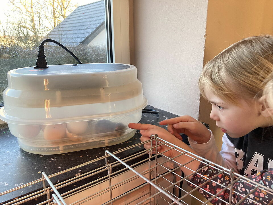 Wissbegierig wurden die Eier mit der Taschenlampe untersucht und dann dem Brutkasten überantwortet. Nach 21 Tagen spannenden Wartens begann dann das erste Küken, seine Eierschale zu durchbrechen, und die Kinder konnten dabei zusehen.