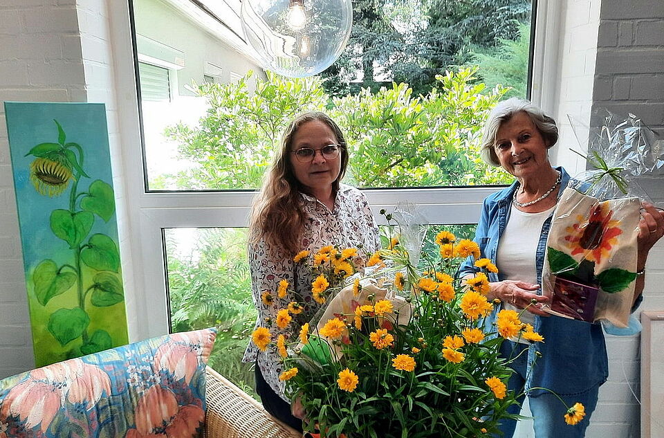 (V. l.) Andrea Ostwald von der Rotkreuz-Kita „Erftzwerge“ überreichte der Künstlerin Sigrid Kroczek als Dankeschön für die erreichte, gigantische Spendensumme von 5000 Euro der Aktion „Flutsonnenblumen“ einen passenden Strauß der gelben Schönheiten. Das Geld soll nun für pädagogisches Material genutzt werden. Foto: DRK-Kita Erftzwerge/pp/Agentur ProfiPress