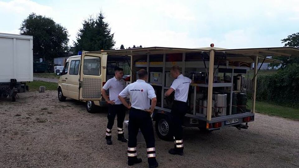 Ein Reifenplatzer zwang am heutigen Mittwochmittag einen Reisebus, vollbesetzt mit Jugendlichen, zu einem Stopp auf einer Straße bei Blankenheim. Völlig überhitzt, wegen eines Ausfalls der Klimaanlage, wurden rund 90 Reisende zum Bürgerhaus nach Blankenheimerdorf verlegt. Die Betreuungseinheit des Roten Kreuzes aus Kall war schnell zur Stelle und reichte den havarierten Gästen kühle Getränke und Snacks. Die Kollegen aus Blankenheim haben ebenfalls mitgeholfen. Die Jugendlichen hatten bereits einige Zeit in der prallen Sonne verbracht und waren teils nicht mehr bei Kräften.