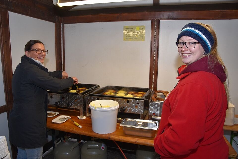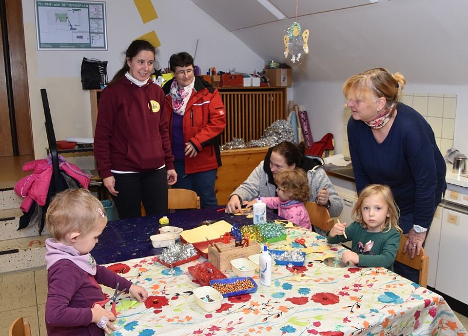 Die DRK-Kindergärtnerinnen bereiten auch eine Menge Sachen mit den Kindern selbst vor, Weihnachtsbaum schmücken, Krippe bauen, Plätzchen für den Verkauf backen, Deko-Gegenstände wie CD-Engel und Tapeten-Christbäumchen basteln und so weiter. Auch für Kaffee, Kuchen, Glühwein, Reibekuchen, Fritten und Würstchen war reichlich gesorgt.