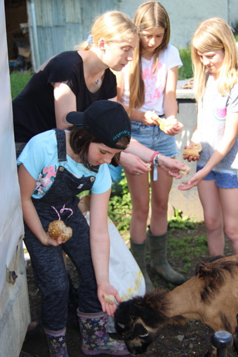 Die Anreise war recht kurzweilig, da die Kinder und Jugendlichen ein Lied selber komponierten. Am Zielort angekommen wurden zuerst die Jungtiere von Schafen und Schweinen mit den übrigen Tieren gefüttert. Hiernach ging es dann zum Aufschlagen des Lagers um ein zweites Frühstück zu essen.