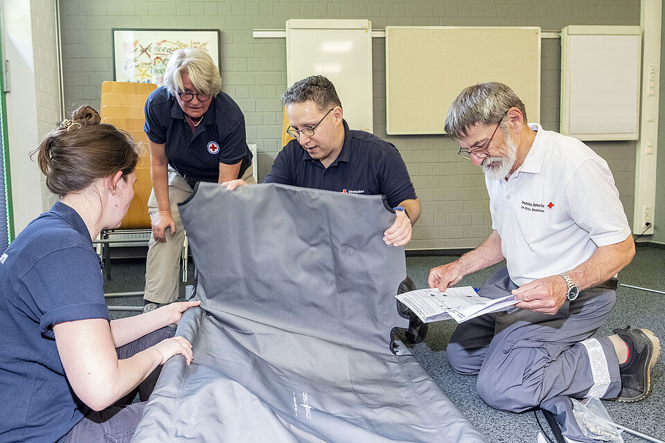 Im Rahmen eines Summercamps in Vogelsang hatten sich die 12 Mitglieder der Schwesternschaften zuvor intensiv auf die Abschlussübung vorbereitet. Sie alle hatten bereits eine Basisschulung mit reichlich Theorie absolviert und konnten nun das Gelernte in der Praxis umsetzen. Dazu gehörte es, zwei Häuser, das Fluchthaus und das Gebäude Transit 59, zu evakuieren und die Bewohnerinnen und Bewohner sicher in die Rotkreuz-Akademie zu bringen, wo ein Konferenzraum zum Bettenlager umfunktioniert wurde. Zur Übung gehörte es dann auch, mobile Pflegebetten der Firma Disc-O-Bett fachgerecht aufzubauen.