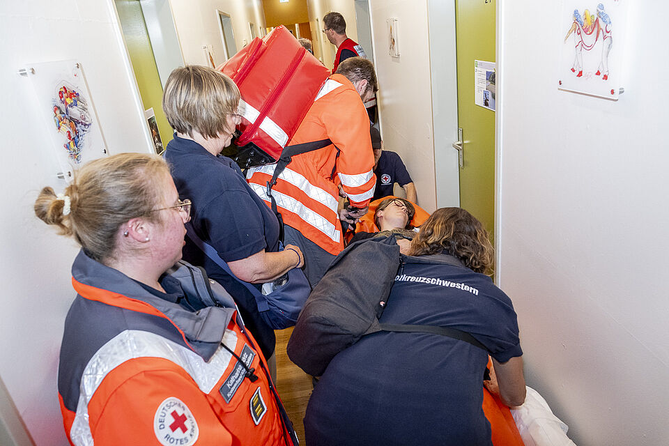 Es herrscht Chaos beim Übungs-Szenario im Transit 59. Das DRK-Gebäude in Vogelsang wird für einige Stunden zur Seniorenresidenz Sonnenschein, die dringend evakuiert werden muss. Das Besondere: Hier sind nicht nur Einsatzkräfte des DRK angerückt, sondern auch examinierte Pflegefachkräfte verschiedener DRK-Schwesternschaften. Gemeinsam sollen sie Hand in Hand darf sorgen, dass die Evakuierung bestmöglich gelingt. Dafür bringen beide Gruppen ihre jeweiligen Stärken mit in den Einsatz. Die einen die Expertise aus dem Katastrophenschutz und die anderen das Wissen um den Umgang mit pflegebedürftigen Menschen.