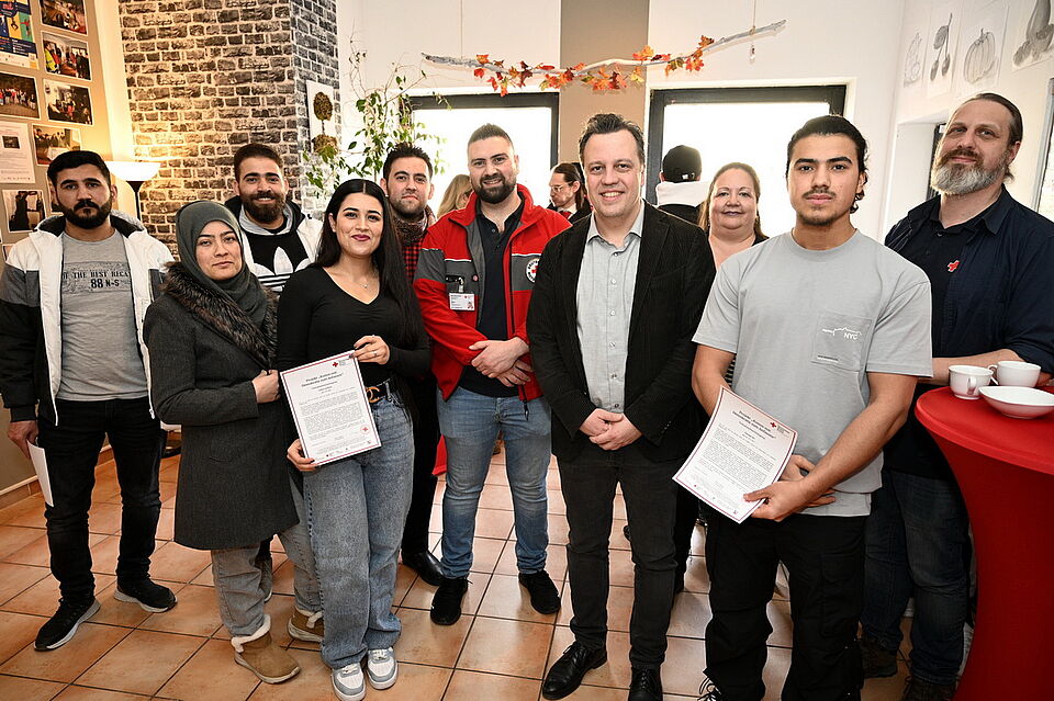 Mit auf Tour war meistens Mounir Alfatwa vom Roten Kreuz. Seine Kollegin Judith Raß von der DRK-Servicestelle für Antidiskriminierungsarbeit sowie seine Kollegen Thomas Weber und Boris Brandhoff von der DRK-Integrationsagentur wohnten der Feier ebenso bei wie der Euskirchener Bürgermeister Sacha Reichelt. Auch ihm hatte die Gruppe einen Besuch im Euskirchener Rathaus abgestattet. Nun war er zu Besuch gekommen, um ihnen zur Feier des Tages ihre Zertifikate zu überreichen
