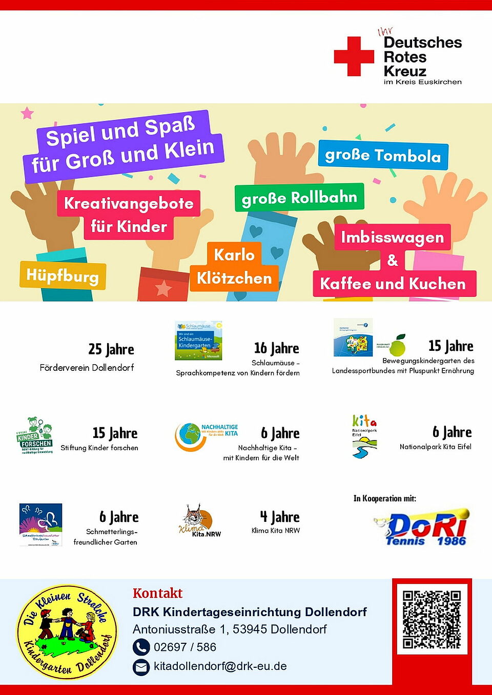 An diesem Tag sind von 14 bis 18 Uhr alle ehemaligen Kindergartenkinder, Kolleginnen, Nachbarn und Freunde des DRK-Kindergartens Dollendorf sowie die örtlichen Vereine herzlich eingeladen mitzufeiern (Antoniusstraße 1, 53945 Dollendorf). Geboten wird übrigens so Einiges: Los geht´s um 14 Uhr mit Festreden und Begrüßungsliedern der Kids. Um 15 Uhr tritt „Maikes Rappelkiste“ auf, bevor der „Musikverein Dollendorf“ ab 16 Uhr live aufspielt.