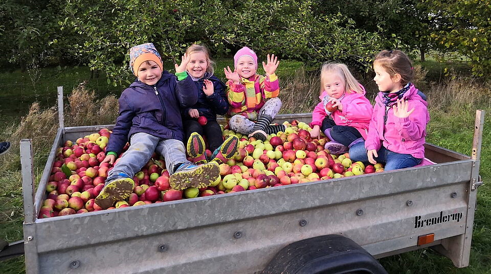 Weil die Streuobstwiesen Netzwerk Nordeifel eG, kurz SoNNe, angekündigt hatte, nach Dollendorf zu kommen, war man sich im Rotkreuz-Kindergarten und dessen Förderverein schnell einig gewesen: Wir lassen uns unseren eigenen Saft pressen. Bei Familie Riethmeister in Dollendorf durften die Kinder dann auch Äpfel pflücken. Acht Kinder mit acht Elternteilen ernteten mit viel Elan und voller Stolz in kurzer Zeit einen ganzen Hänger voll. Ein paar der Äpfel schafften es übrigens nicht auf den Hänger, sondern wurden noch vor Ort als kleine Stärkung bei der Arbeit verspeist.