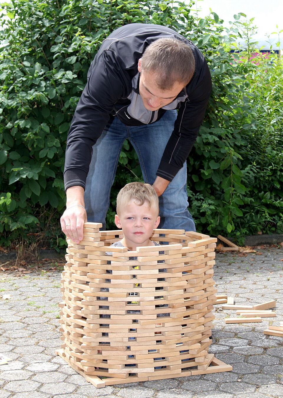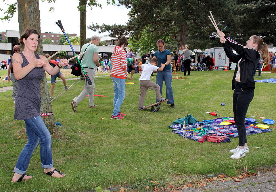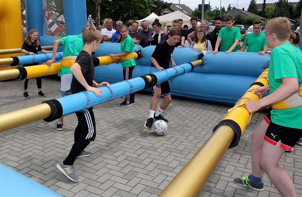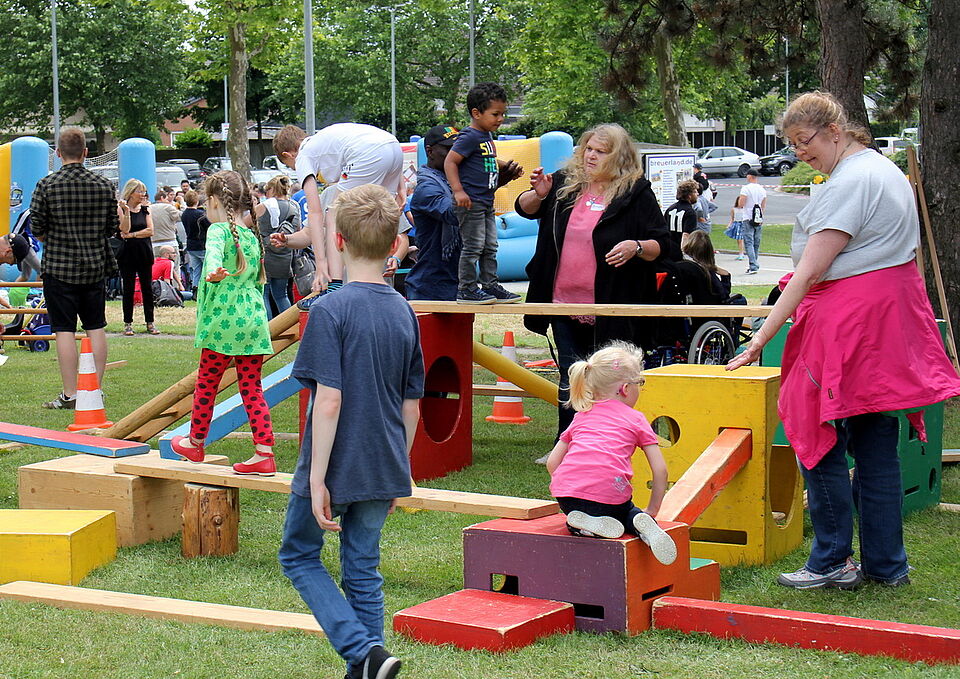 Besonders beliebt ist natürlich jedes Mal das integrative Menschen-Kickerturnier, bei dem zwar auch der Wettbewerb, aber gleichzeitig auch das Miteinander – wie beim gesamten „Tag der Begegnung“ – im Mittelpunkt steht. Ebenfalls begeistert waren die Kinder von Bella Baustelle und Karlo Klötzchen. In der „Baustelle“ mussten die Kinder klettern, balancieren und den Bewegungsparcours absolvieren. Bei Karlo Klötzchen hingegen ist Ruhe angesagt, denn aus vielen kleinen Holzklötzchen können imposante Türme gebaut werden. Wie bei „Jenga“ gilt hier: Einmal einen falschen Klotz gezogen, bricht das fragile Bauwerk zusammen.