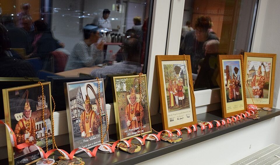 Schön und liebevoll jeck sind die Räume geschmückt. Die Blutspendebeauftragte hat, wie es für sie gute alte Tradition ist, die Fotos vergangener Euskirchener Tollitäten auf den Fensterbänken platziert und die „Ahnentafel“ noch mit Luftschlangen verziert. Fröhlich, die Arme ausbreitend, erläutert sie: „Das sind alle, die seit den Anfängen der Prinzenblutspende hier waren.“ In elf Jahren kommen da schon einige Exemplare zusammen.