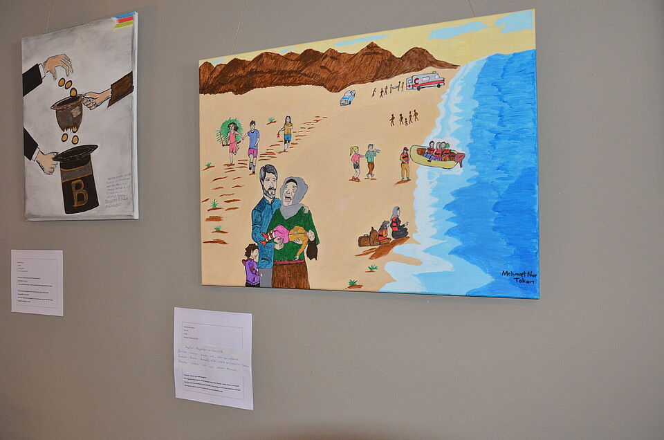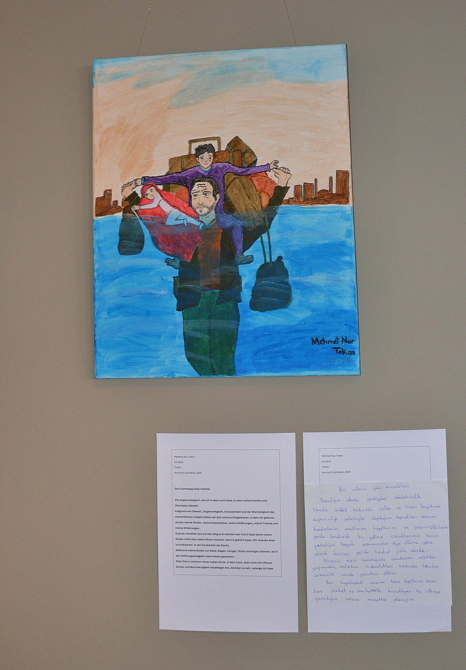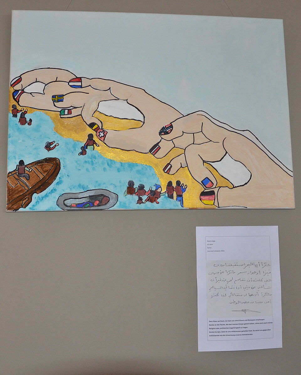 „All das habe ich auf meiner 13-tägigen Flucht eins zu eins erlebt – vor rund drei Monaten…“, so Turkan, aus dem Türkischen ins Deutsche übersetzt von Nevin Sezgin, Mitarbeiterin des DRK Kreisverbands Euskirchen. Andere Bilder zeigen ähnliche Umstände: Krieg, Zerstörung, Gewalt und Trauer. Eine Malerei stellt metaphorische Hände mit Fingernägeln aus Länderflaggen dar, die Menschen mitsamt ihren Booten wieder in die lebensbedrohlichen Fluten „zurückschnippen“.