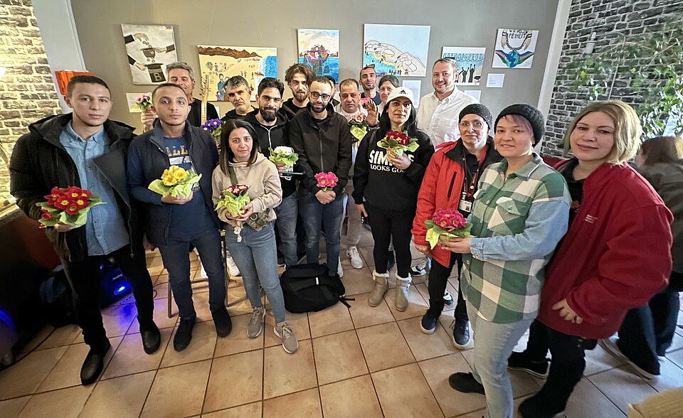 Er ist einer von 13 neuzugewanderten Künstlerinnen und Künstlern aus Albanien, Aserbaidschan, Palästina, Syrien, der Türkei und der Ukraine, die nun im Kreis Euskirchen leben. In einem Kunstprojekt haben sie sich künstlerisch und individuell mit den Themen Flucht, Ankommen, Diskriminierung und Solidarität auseinandergesetzt.