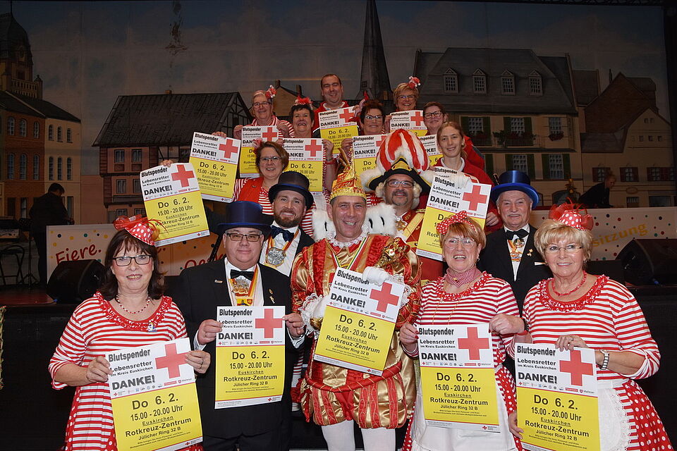 Für Tollitäten und kostümierten Anhang werde ein eigener Raum reserviert, so die Blutspende-Beauftragte: „Um die anderen Spender nicht zu stören.“ Lecker zu essen und zu trinken gebe es hingegen für alle. Das gelte im Übrigen für alle Rotkreuz-Blutspende-Termine im Kreis: „Die Bewirtung durch spezielle Rotkreuzteams ist immer und überall vorzüglich!“