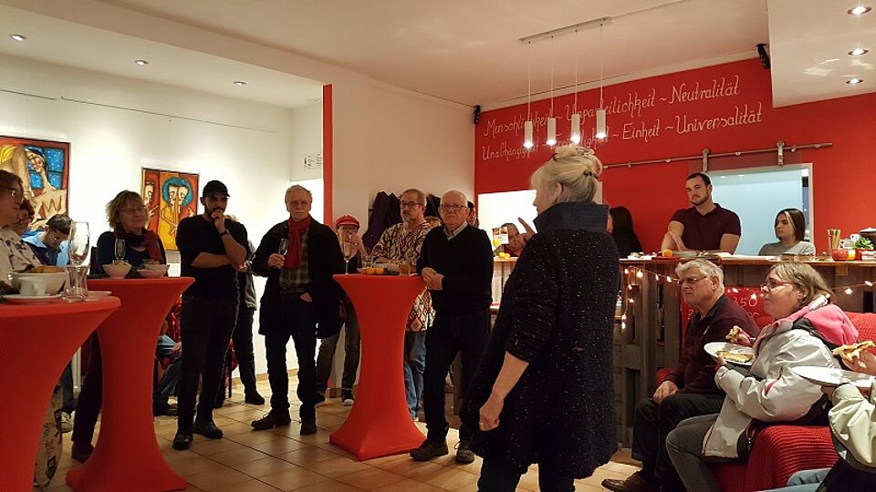 Die international ausgewiesene Künstlerin Maf Räderscheidt würdigte im Anschluss Ismail Laghbabas künstlerisches Werk. Laghbabas Weg als Künstler verfolge sie seit 2016. In dieser Zeit habe er sich beeindruckend entwickelt. In den im Café Henry ausgestellten Bildern habe er, ausgehend vom Surrealismus eines Francis Bacons und eines Egon Schieles, eine ganz eigene Bildsprache gefunden und interkulturelle Weltkunst geschaffen.