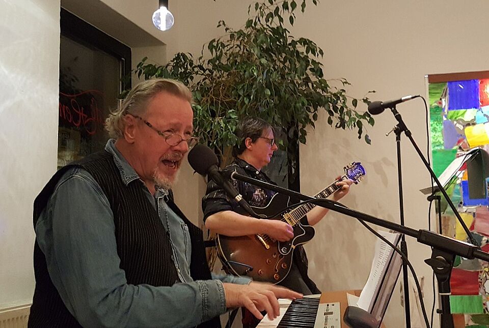 Im Anschluss an die Vernissage gab das Blues-Kabarett-Duo „Die halbnackten Rentner“ ein Gastspiel im Café Henry – das sind der in ganz Deutschland bekannte Kabarettist und Autor Achim Konejung (Gesang und Keyboard) und der Autor, Musiker und Journalist Stephan Everling (Jazz-Gitarre).
