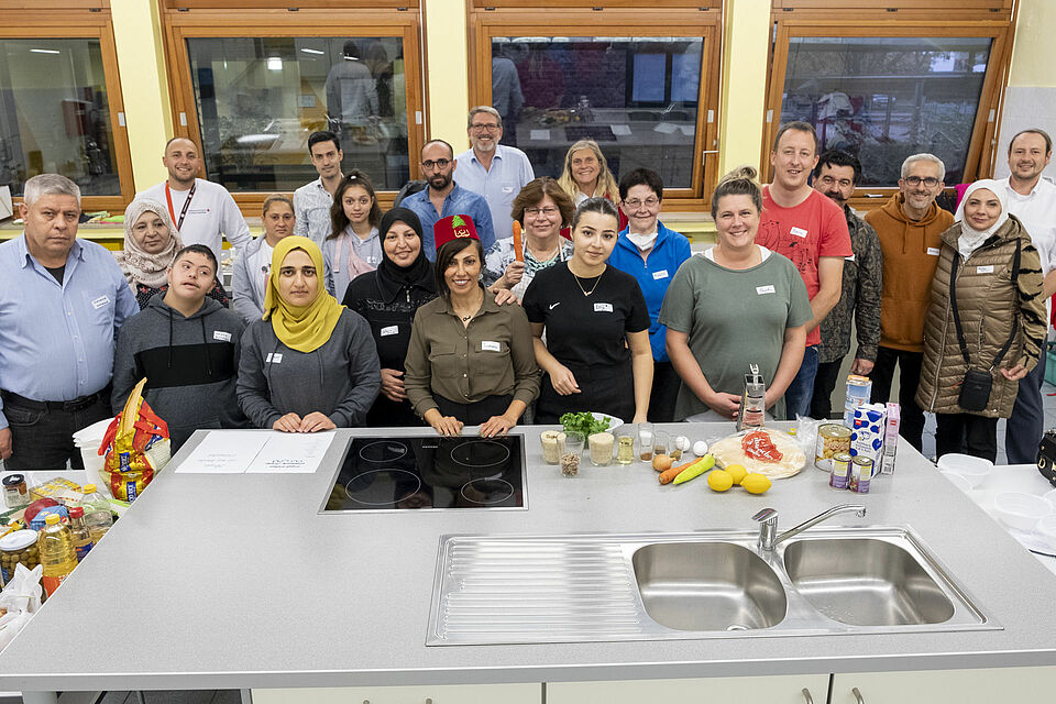 Dafür hatten Weber und Kuhlen, die Gastköchin Joumana El-Khodr und ihre Tochter Enji Msatat ins Thomas-Eßer-Berufskolleg eingeladen. Gemeinsam mit 33 Teilnehmerinnen und Teilnehmern aus acht Nationen wurde an fünf Kochinseln ein köstliches Drei-Gänge-Menü gezaubert.