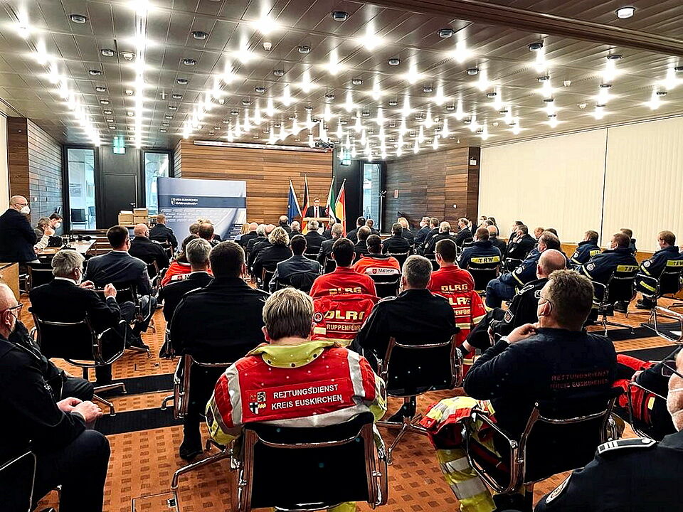 Insgesamt würden im gesamten Kreis Euskirchen rund 3.500 Medaillen samt Urkunden überreicht. Stellvertretend hätten Wehrleiter und Bürgermeister aller elf Kommunen die Medaillen für die Feuerwehren entgegengenommen, für die Einsatzkräfte der Organisationen waren Vertreter des Roten Kreuzes, des DLRG, der Malteser, des THW, der PSNV-E, des Rettungsdienst, der Leitstelle und des Führungsstabs anwesend.