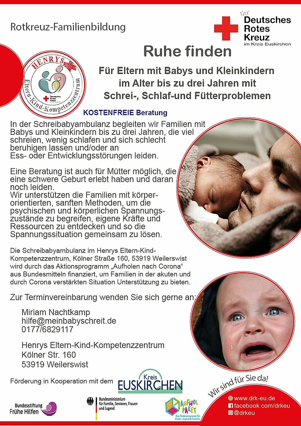 Maryam Schlösser vom Euskirchener Familienbüro betonte: „Mit der Unterstützung durch das Förderprogramm »Aufholen nach Corona« können wir als Abteilung für Jugend und Familie des Kreises Euskirchen die Schreibabyambulanz fördern.“ „Aufholen nach Corona“ bietet deutschlandweit Möglichkeiten für Kinder, Jugendliche und ihre Familien sich zu begegnen, gemeinsam Neues zu entdecken und ihre Welt nach der Pandemie zu erleben. Dazu bringt das Bundesministerium für Familie, Senioren, Frauen und Jugend eine Vielzahl an unterschiedlichen Kooperationspartnern zusammen. Junge Eltern und ihre Kinder sollen intensiver unterstützt und entlastet werden, damit die Familien trotz Pandemie als erster „Bildungsort“ gestärkt und so eine Basis für gute Entwicklungsmöglichkeiten der Kinder geschaffen wird.
