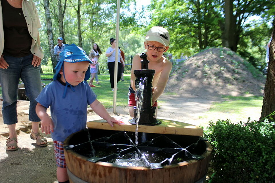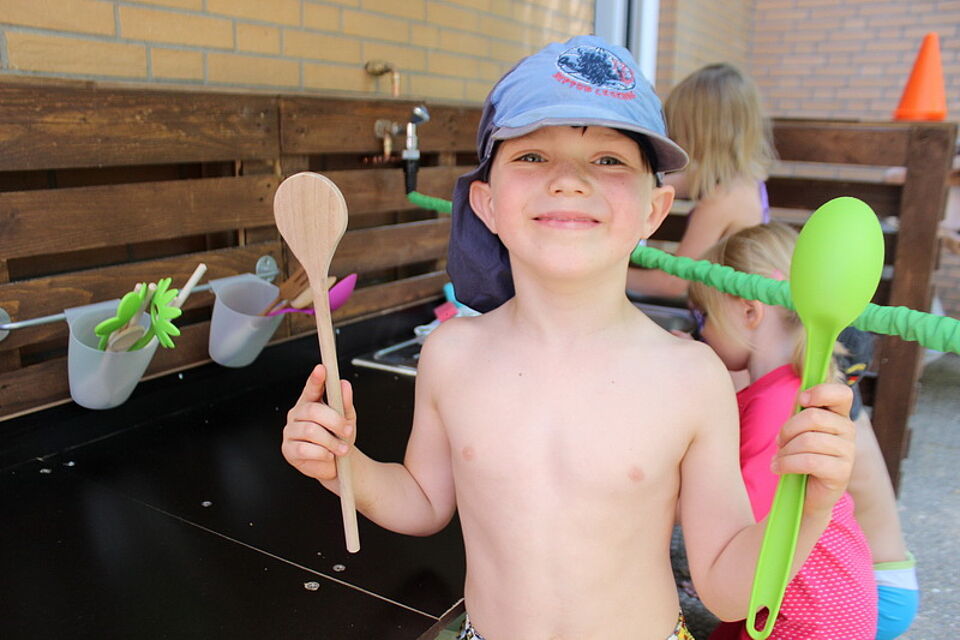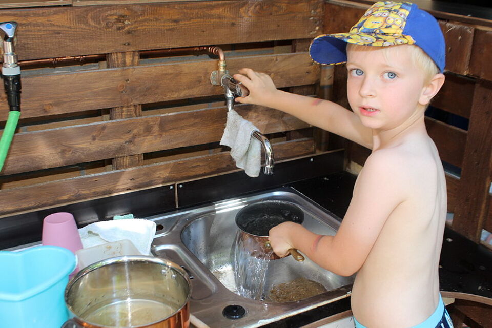 Kräftig gepumpt wird natürlich auch an der „Bütt“. Förmchen, Töpfe und Sand werden schnell gebracht. In der Küche werden derweil phantasievolle „Kuchen“ gebacken und herzhafte „Suppen“ gekocht. Für Kinder gibt es doch nichts Schöneres als mit Wasser ausgiebig zu matschen.