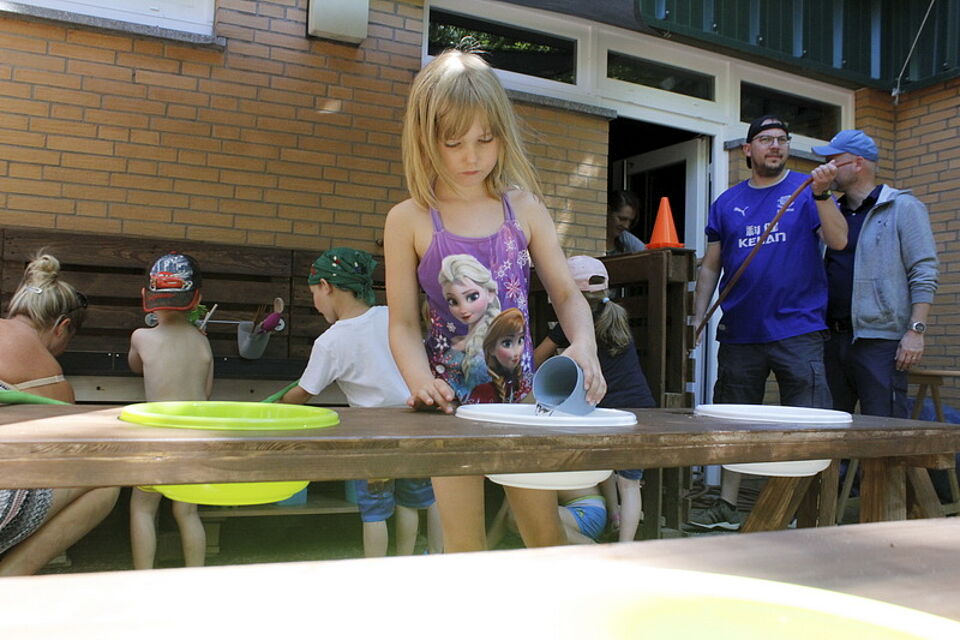 Nun heißt es: „Wasser marsch!“ Und das kühle Nass saust durch den gift-grünen und ewig langen Schlauch an die richtigen Stellen im neuen Matsch-Areal. Mit „Yippie!“-Rufen stürmen die Kinder in Badekleidung los. Zu Ehren des Tages sind auch Planschbecken und eine Wasser-Rutsche aufgebaut. Die Kinder haben viel Spaß.