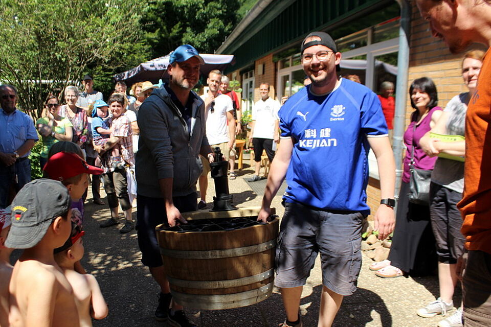Eine besondere Überraschung haben die Elternvertreter für die Kinder mitgebracht. Schwer haben sie zu schleppen, als sie zu zweit und unter großem Applaus der Gäste eine große Bütt für den neuen Matschbereich heranbringen. „Daran ist eine richtige Pumpe“, verraten sie den Kindern die Funktion des schmiedeeisernen Hebels.