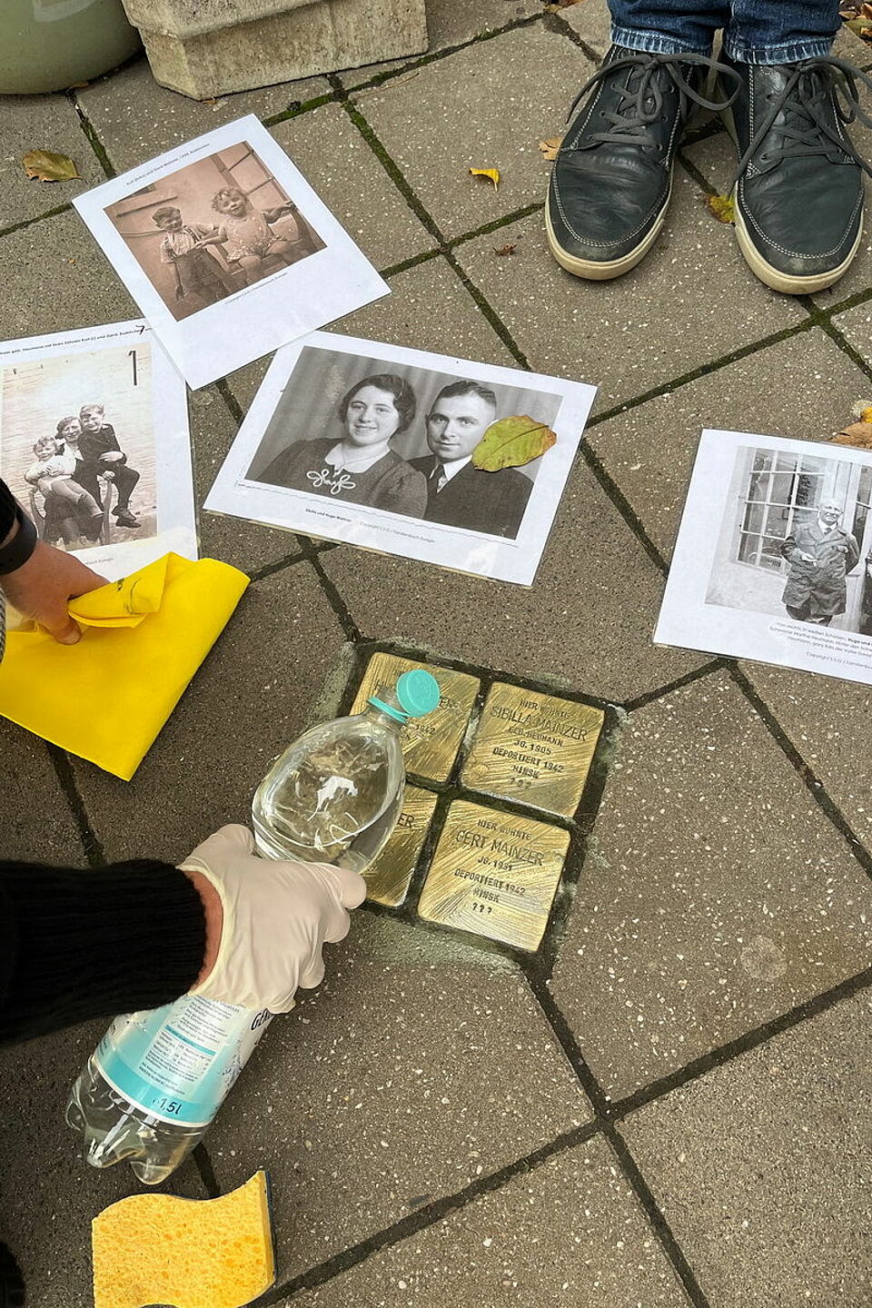 Nach den Workshops ging es schließlich aufgeteilt in verschiedene Gruppen raus, um die Stolpersteine zu reinigen. Roland Kuhlen vom Kommunalen Integrationszentrum des Kreises Euskirchen hatte zu allen Schicksalen Informationen recherchiert. Zum Beispiel, dass am Tag nach der Pogromnacht, am 10. November, das Haus und das auf dem Annaturmplatz parkende Auto der Familie Horn angezündet wurde. Die Familie hatte in der Kommerner Straße ein Möbel- und Warenhaus betrieben.