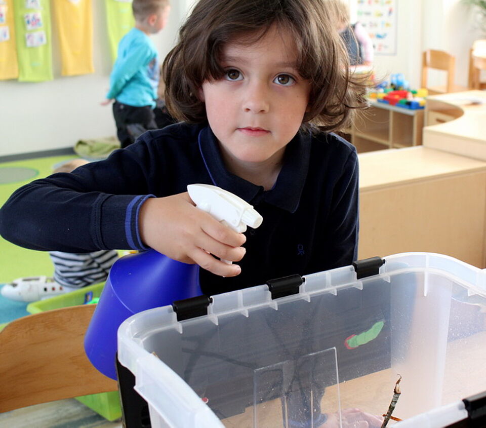 Jeden Tag müssen die Kinder die Schmetterlingsbox saubermachen und neue Brennnesseln hineinlegen. Für das Gehege der Raupen haben sie außerdem Äste besorgt. Und weil die Raupen es gerne feucht mögen, wird die Box vorsichtig mit Wasser benässt.