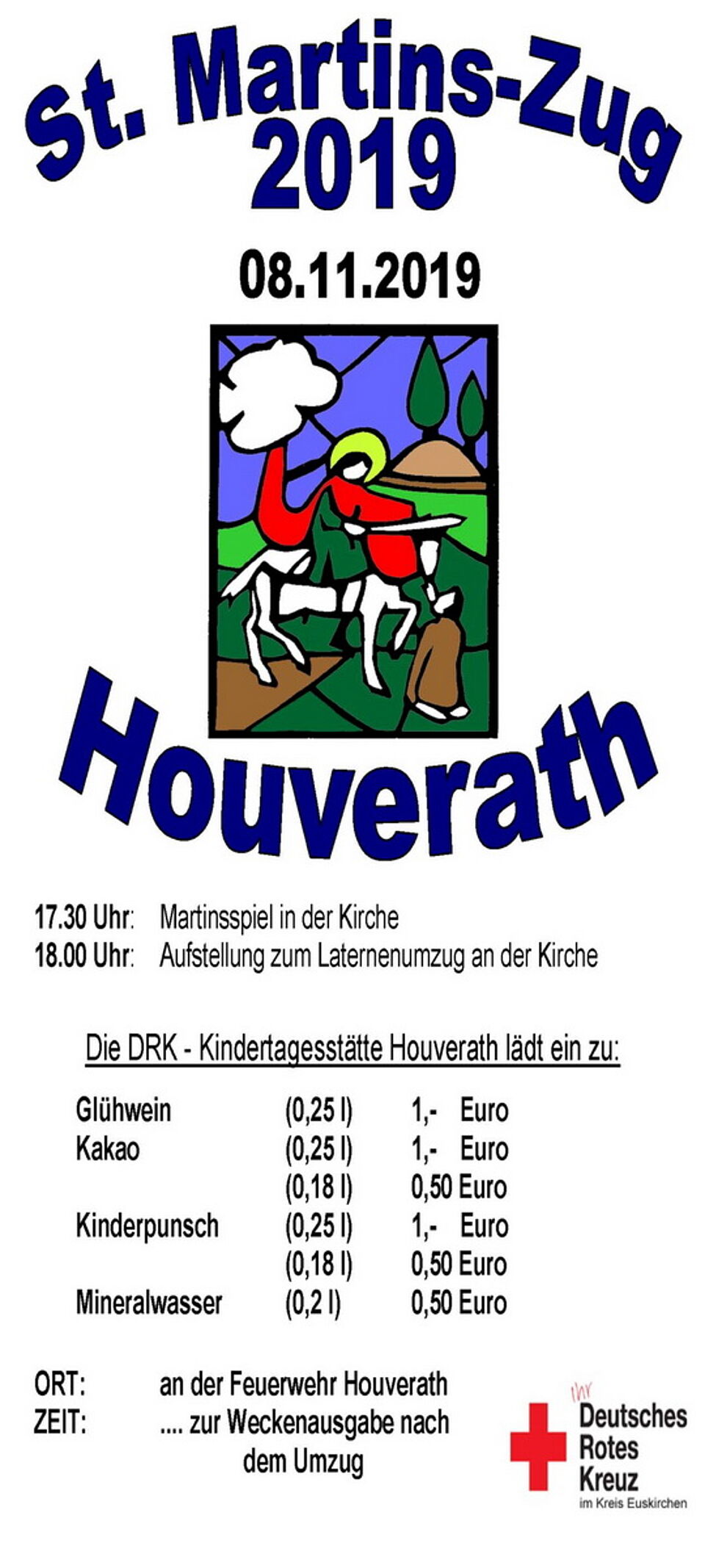 Bad Münstereifel-Houverath – Sankt Martin kommt nach Houverath, genauer gesagt zum Roten Kreuz in die örtliche DRK-Kindertagesstätte Houverath – und zwar am Freitag, 8. November, ab 17.30 Uhr. Dann findet zunächst ein Martinsspiel im Kindergarten statt.