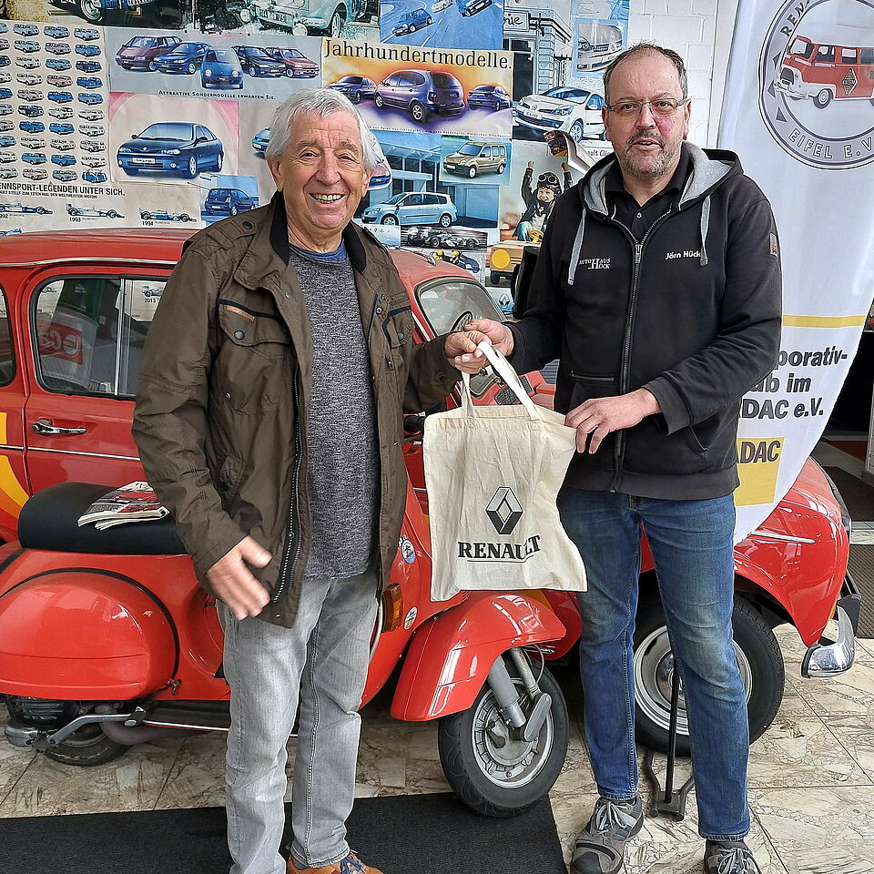 Eine Spende von 1678,90 Euro konnte Greuel vom Vorsitzenden des „Renault Oldie Club Eifel“, Jörn Hück, in Empfang nehmen. Bereits zum 26. Mal hatte der Club im Sommer rund um das Roggendorfer „Autohaus Hück“ ein Treffen von Besitzern von Renault-Oldtimern organisiert. Seit 26 Jahren wird dieses Treffen in Roggendorf zugunsten der Hilfsgruppe ausgerichtet.