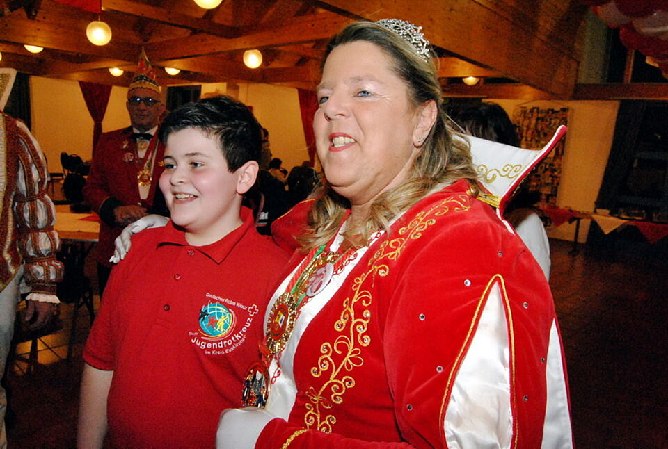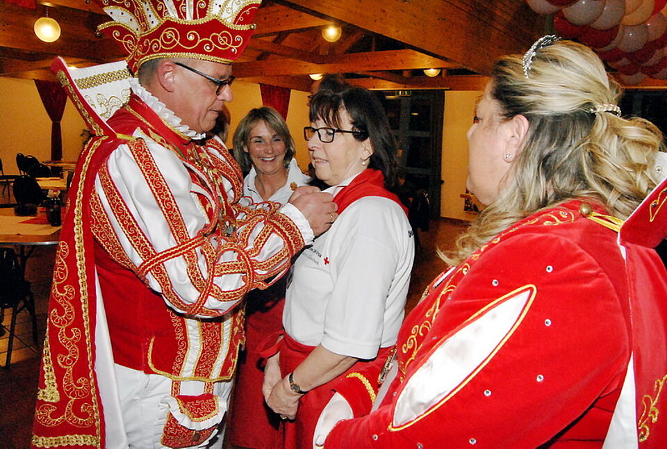 Während Prinz Guido I. aus gesundheitlichen Gründen nicht spenden durfte, gingen Prinzessin Sabine II. und Mitglieder der KG Greesberger mit gutem Beispiel voran. Als kleines Dankeschön überreichten Rolf Klöcker und Blutspendebeauftragte Edeltraud Engelen warme Winterschals des DRK, die farblich perfekt zum Tollitäten-Ornat passten. Aber auch das Prinzenpaar ließ sich nicht lumpen und dekorierte die Helfer des DRK-Ortsvereins und des Jugendrotkreuzes mit Ansteckern und Orden.