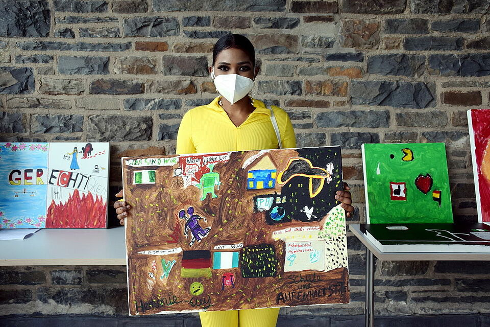 „Ja“, sagt Eley leise. Das Bild zu malen, sei ihr schwergefallen. Das Malen habe sie aufgewühlt, weil wieder alles hochkam, die Gefühle, die so gut und tief im Innern versteckt lagen. Ihr Bild steht nicht alleine, sondern in einer Reihe mit elf weiteren. Alle wurden sie in einem Workshop mit dem Titel „Empowerment“ gemalt und anlässlich des Weltflüchtlingstags zu „Grenzen und Herausforderungen“ auf der ehemaligen NS-Ordensburg Vogelsang ausgestellt. Zu jedem Werk gehört ein Gesicht und eine Geschichte.