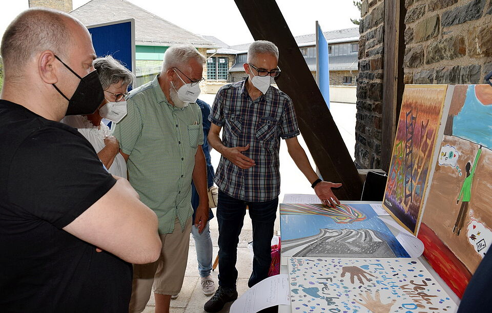 Zwölf Menschen haben an dem kreativen und künstlerischen Workshop teilgenommen. Auch der Mechernicher Hassan Hasno ist einer davon. Gleich nach Eröffnung der Ausstellung wird er von einem Besucher auf sein Bild angesprochen. Sie kommen ins Gespräch. „Malen?“, das sei für ihn „das erste Mal“, sagt Hassan Hasno. Sein Bild zeige „Gut und Böse, den Kampf zwischen Gerechtigkeit und Ungerechtigkeit, zwischen Freiheit und Dunkelheit“ und lässt die Zerrissenheit erahnen.