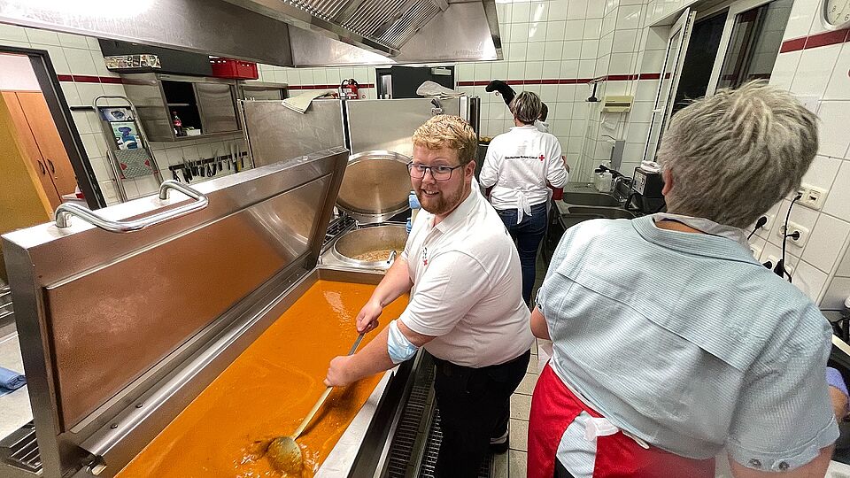 Für das DRK ging es in den ersten Stunden der Flut vor allem um lebensrettende Maßnahmen und dann natürlich darum, die Notunterkünfte einzurichten und zu betreiben oder auch die betroffenen Menschen in ihrer häuslichen Umgebung zu verpflegen und zu betreuen. Später dann unterstützte das Rote Kreuz die in den vielen Ortsteilen gebildeten Bürgerstützpunkte mit Einsatzkräften und Logistik. Es ging auch darum, die Versorgung mit Gütern des täglichen Bedarfs wie Hygieneprodukte und Lebensmittel sicherzustellen. In den DRK-Großküchen und anderen Großküchen heraus wurden täglich über 1.000 Essen an Einsatzkräfte und nochmals über 1.000 Essen an Betroffene herausgegeben. „Eine enorme Leistung unserer Mitarbeiterinnen und Mitarbeiter“, so Rolf Klöcker.