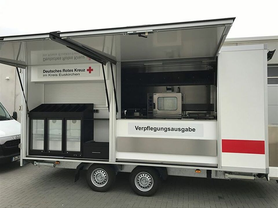 Das neue Fahrzeug auf Basis eines Anhängers erfüllt alle Anforderungen an eine moderne Großküche und ist vollständig autark und fast überall einsetzbar. Ausgestattet mit modernster Küchentechnik auf Propangas-Basis, können die Verpflegungsspezialisten auf ein hochmodernes Einsatzmittel zurückgreifen. Zusammen mit den stationären Einsatzküchen und einem umfangreichen Netzwerk an Partnerunternehmen, die eine 24h Nachschubversorgung garantieren, ist das Rote Kreuz im Kreis Euskirchen als Spezialist für Einsatzkräfteversorgung bestens aufgestellt.
