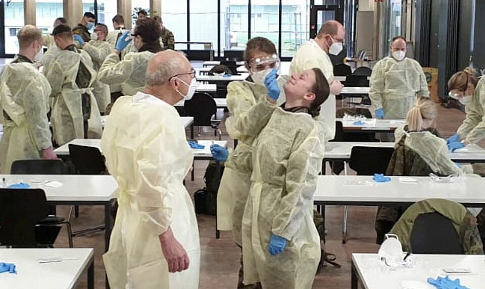 Neun Seniorenheime hatten beim Kreis Euskirchen einen Bedarf zur Unterstützung durch die Bundeswehr bei Corona-Schnelltests angemeldet. Deshalb helfen die Soldatinnen und Soldaten seit dem 1. Februar beim Testen von Besuchern, Personal und Dienstleistern wie Handwerkern. „Die Bundeswehr unterstützt uns ja bereits seit Längerem bei der Kontaktnachverfolgung und auch im regionalen Impfzentrum“, so Landrat Ramers. „Ich freue mich, dass wir jetzt Verstärkung für unsere Alten- und Pflegeheime begrüßen können.“