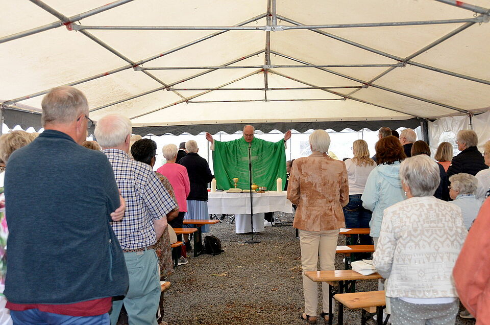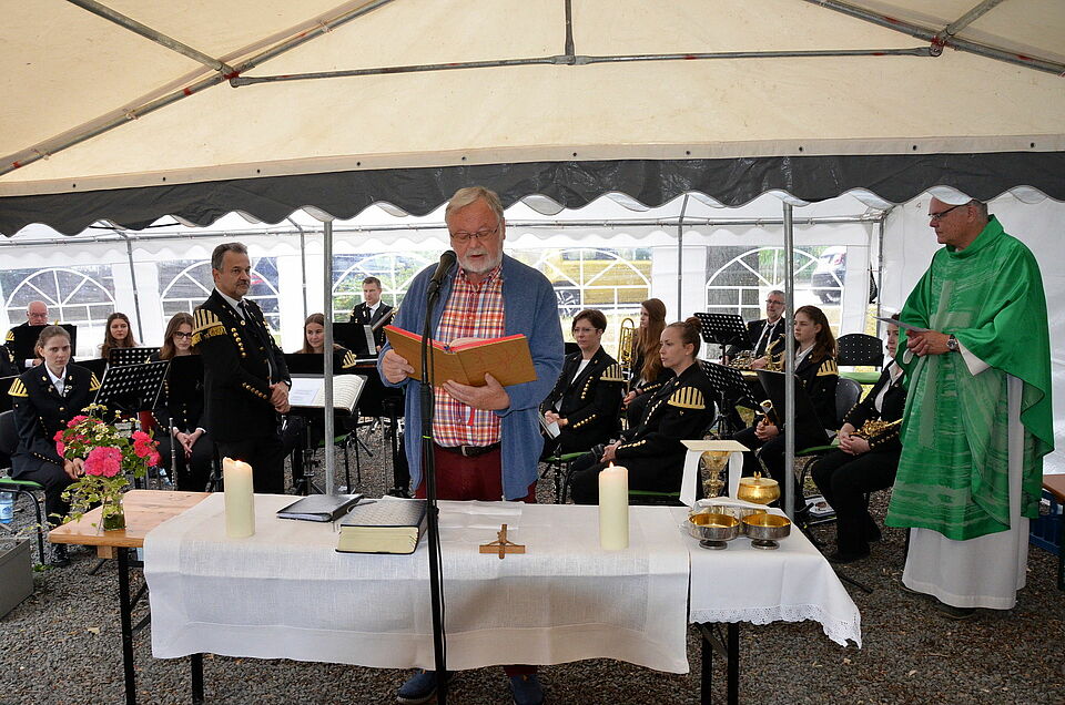 Mechernich – Das Zelt war aufgebaut, die Instrumente gestimmt… und das traditionsreiche Mechernicher Bergfest konnte wieder losgehen. Zelebriert wurde es im Rahmen eines Open-Air-Gottesdienstes am Bergbaumuseum mit GdG-Pfarrer Erik Pühringer, samt kirchlicher Live-Musik der Mechernicher Bergkapelle und gemeinsamem speisen, trinken und plaudern im Nachgang.