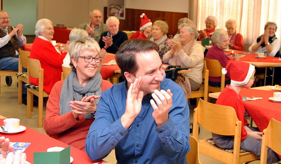 Eine ganze Armada fleißiger kleiner Nikoläuse kümmerte sich unermüdlich um das Wohlergehen der betagten Gäste. 20 Kinder im Alter von vier bis 13 Jahren servierten mit Feuereifer Kaffee und Kuchen. Zwischendurch gab es Gedicht- und Liedvorträge, die den alten Leuten sichtlich Freude bereiteten. Durch das Programm führte souverän das Moderatoren-Quartett Ben, Can, Tamino und Silas, die es nicht versäumten, die kleinen Bühnenkünstler für ihre Auftritte zu loben: „Das habt ihr super gemacht.“ Das fanden auch die Senioren, die kräftig applaudierten, vor allem der kleinen Malina, die mit gerade einmal vier Jahren ohne jede Scheu das Gedicht von den „Zehn kleinen Nikoläusen“ aufsagte.