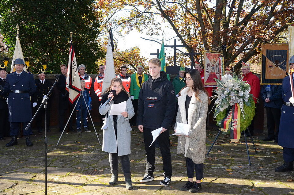 Viel Anerkennung und Zustimmung bekamen auch die drei dieses Jahr noch sehr jungen „Festredner“ bei der anschließenden Feierstunde am Mechernicher Ehrenmal an der Alten Kirche. Caja Bank, Giada La Rosa und Jonah Beul - alle aus dem Abiturjahrgang am Gymnasium am Turmhof -, setzten sich auf ihre Art mit dem Volkstrauertag auseinander – und kamen zu dem vernichtenden Ergebnis, dass weder der Krieg, noch die Erinnerung an seine Opfer wirkliche Relevanz für ihre Altersgenossen besäßen.