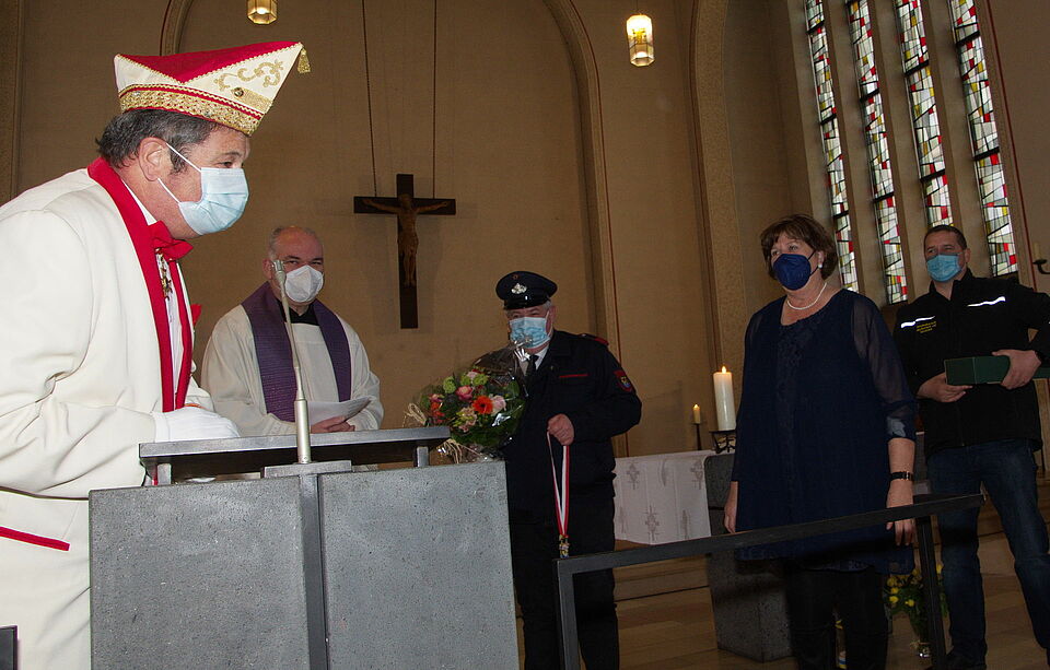 Vor Pastor Pühringers Schlusssegen bedankten sich Fahnenabordnungen kirchlicher Mechernicher Vereine, aber auch von TuS und Rotem Kreuz bei Marlies Lottermoser, die am Bleiberg eine „Institution“ gewesen sei und als solche auch in Erinnerung bleibe, so Marcel Hembach als Chef des Vereinskartells, der in Feuerwehruniform gratulierte. Aus den Händen von Festausschuss-Präsident Albert Meyer erhielt die scheidende Kindergartenleiterin einen Karnevalsorden.