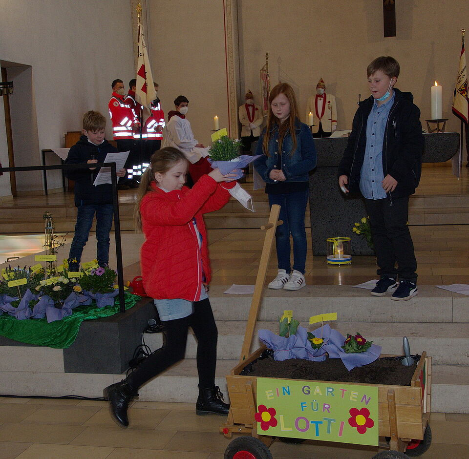 Zum Auftakt sang der neue Kinderchor um den Kirchenmusiker Erik Arndt, dann Marlies Lottermosers Kindergartenkinder unter der Leitung ihrer Nachfolgerin Eva Zimmers: „Gestern, heute und morgen bin ich geborgen in Deiner Hand“. Dann schenkten die „Pänz“ ihrer „Lotti“ einen ganzen Blumengarten mit äußerst symbolträchtigen Gewächsen, die sie einzelnen in einen mit Erde gefüllten Bollerwagen setzten.