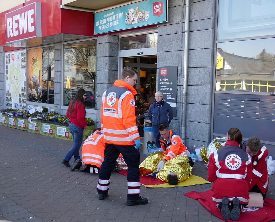 An der ersten Station galt es neben der Versorgung einer kollabierten Person auch noch die unter Schock stehenden Angehörigen zu betreuen und bei Bedarf auch adäquat zu versorgen. Die Tatsache, dass dies mitten in einer um diese Uhrzeit gut frequentierten Passage oder auch genau vor dem Eingang des Rewe-Marktes stattfand, sorgte sicher nicht nur bei den jüngsten Teilnehmern für zusätzliche Aufregung. Bei den Passanten sorgten die „Minis“, die jüngsten Retter mit ihren Betreuern Nicole Thielen und Thomas Derichs, für manch erstaunten Gesichtsausdruck. Emily Bienentreu, ist mit fünf Jahren nun bereits zum dritten Mal beim Rotkreuz-Wettbewerb dabei und demonstrierte neben der erforderlichen Beatmung auch den souveränen Umgang mit dem Defibrillator. Genau diesen Effekt wollten die Organisatoren des Wettbewerbs auch erzielen, teilte Simon Jägersküpper auf Nachfrage mit: „Wir haben gehofft, die Menschen damit noch einmal ganz anders zu erreichen. Das scheint zu funktionieren, viele haben angehalten und gefragt was passiert hier eigentlich gerade. Das zeigt uns, es war exakt der richtige Schritt mit dem Wettbewerb raus in die Stadt zu gehen.“