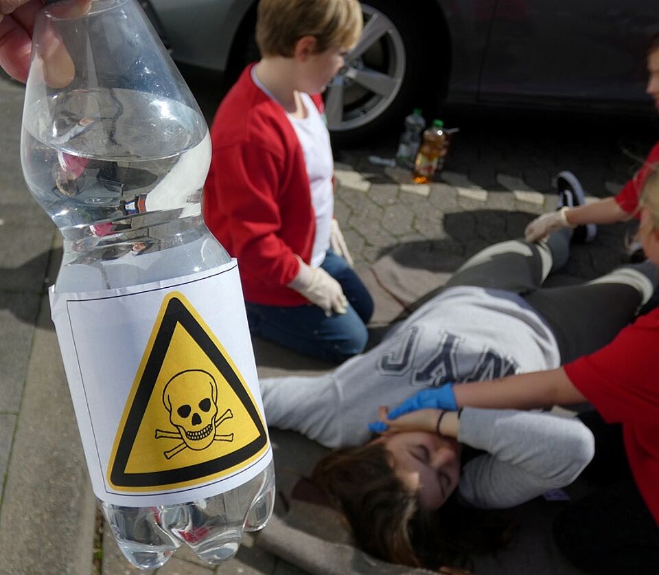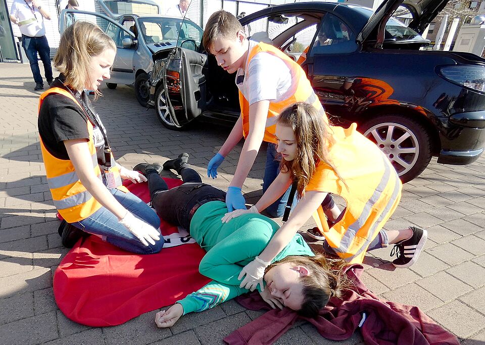 Mechernich/Kreis Euskirchen – Lange schon träumten die Organisatoren des kreisweiten DRK-Erste-Hilfe-Wettbewerbs davon, neue Wege zu gehen und den Wettbewerb komplett nach draußen zu verlagern. In diesem Jahr ist ihnen das nun geglückt. An vier Stationen (eine davon an zwei verschiedenen Standorten), verteilt im Kernort Mechernich, mussten die Teilnehmer der insgesamt 14 Gruppen vielfältige Aufgaben unter nahezu realistischen Bedingungen erfüllen. Lediglich die schriftliche Prüfung fand nach wie vor in den Räumen des Gymnasiums Am Turmhof (GAT) statt.