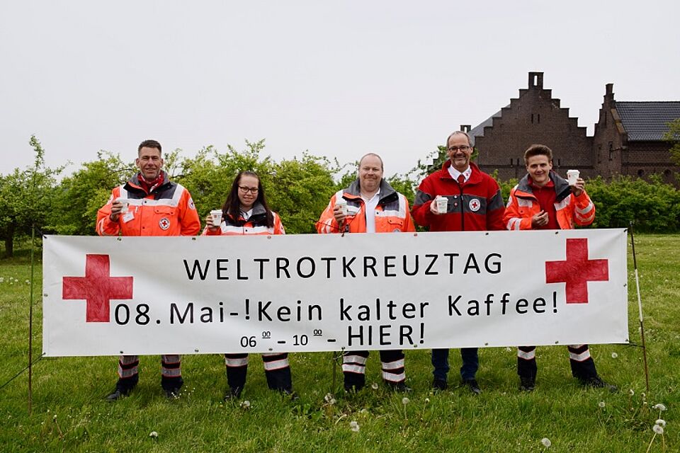 Mit der Aktion am Weltrotkreuztag warb das Rote Kreuz im Kreis Euskirchen für das Ehrenamt und erinnerte an Gründer Henry Dunant – Warm-dampfende Getränke am Burghof in Kommern an Passanten und Autofahrer ausgeschenkt