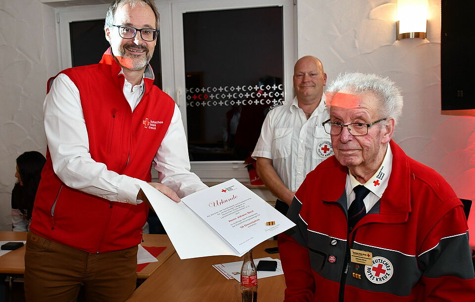 Unter anderem ehrten Ortsvereinsvorsitzender und Kreisgeschäftsführer Rolf Klöcker und der stellvertretende Rotkreuz-Kreisvorsitzende Wilfried Müller den 93jährigen bislang amtierenden Schatzmeister Johann Beul für 50 aktive Dienstjahre, Bereitschaftsleiter Sascha Suijkerland für 30 und Burkhard Kühn für 25 Jahre Dienst am Nächsten.