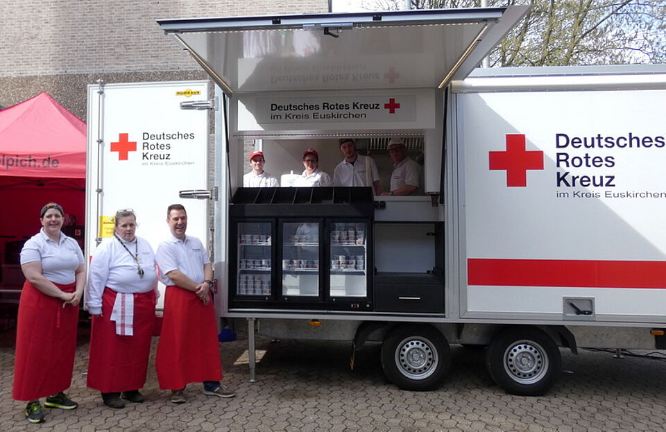 Zum zehnjährigen Bestehen gab es dann auch noch eine Premiere. Der altgediente Rotkreuz-Verpflegungsbus, der bei den vergangenen neun Wettbewerben treue Dienste geleistet hatte, wurde vor Kurzem vom Tüv in den wohlverdienten Ruhestand geschickt. DRK-Küchenchefin Gaby Weinand und ihr Team sorgten nun in einer mobilen Küche für das leibliche Wohl der Helfer und Teilnehmer. „Das ist der erste Einsatz der mobilen Küche und somit die Feuertaufe,“ erklärte Gaby Weinand.