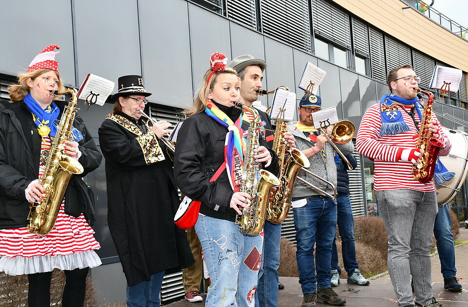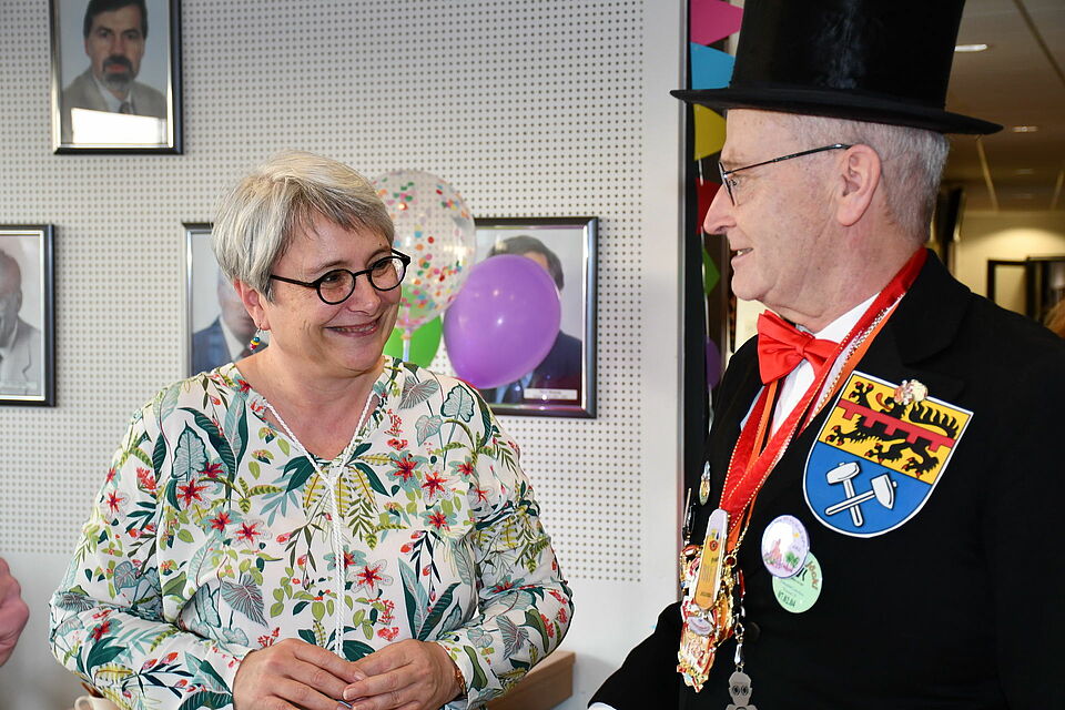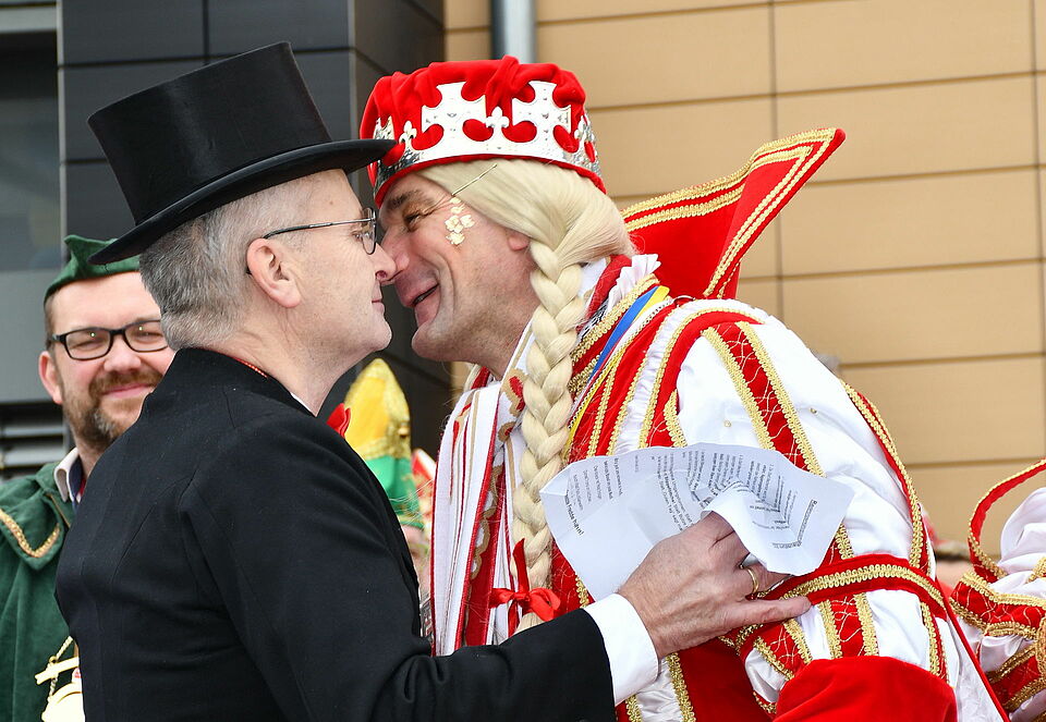 Auf der Bühne verordnete Dr. Schick der Stadt über die tollen Tage andere Umgangsformen, zum Beispiel „Stippeföttche“ statt Händeschütteln, was er mit Prinz Frank I. (Gummmelt) an Ort und Stelle vorführte - und „Nasenreiben wie die Eskimos“, was der Verwaltungschef mit Jungfrau Dunja (Falk Lotzinski) demonstrierte.