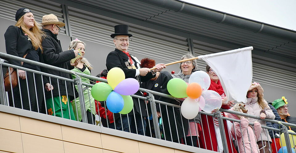 Bereits der dritte wassergefüllte Luftballon, den der Erste Beigeordnete und stellvertretende Verwaltungschef von der Rathausbrüstung auf die angreifenden Karnevalsjecken schleuderte, traf das Mischpult der Lautsprecheranlage und schaltete alle Mikrophone stumm. So erfuhren die närrischen Zaungäste nur noch rudimentär, was ihnen die von Karl „Charly“ Theißen (Prinzengarde Mechernich) und Ralf Schumann (KV Vussem von 1977) angefeuerten Fastelovends-Enthusiasten zu sagen hatten.