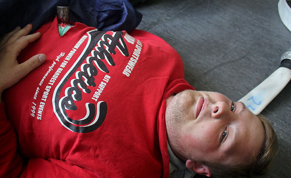 Einige lagen in der Halle zwischen Kartons, andere spielten, als seien sie in einem Schockzustand und liefen auch nach ihrer Rettung ständig zurück in die Einsatzstelle – oder ließen sich gar nicht erst nach draußen geleiten und waren renitent, wie Sascha Suijkerland von der DRK-Bereitschaft Mechernich. „Ich hatte heute Morgen beim Aufstehen schon so ein dummes Gefühl“, brüllte er und hatte sichtlich Freude an seiner Rolle. In Ruhe gelassen wolle er werden, sein Mittagessen genießen, dass ihm bei der Explosion um die Ohren geflogen war.