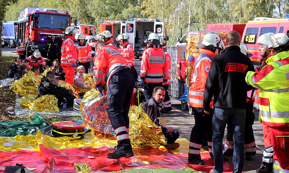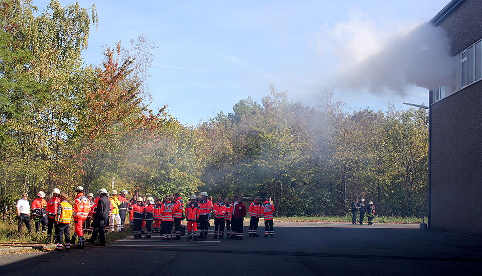 Dank der Nebelmaschine der Feuerwehr Euskirchen qualmte es ordentlich aus den Bürofenstern im Obergeschoss. Dieser Trakt war so verraucht, dass man die Hand vor Augen nicht sehen konnte. Dutzende Freiwillige harrten in dem Disco-Nebel aus, um zu Übungszwecken gerettet zu werden. Die insgesamt 71 „Verletzten“ stammten unter anderem vom Roten Kreuz und der Feuerwehr. Von 9 Uhr an wurden sie geschminkt und auf den Ernstfall vorbereitet.