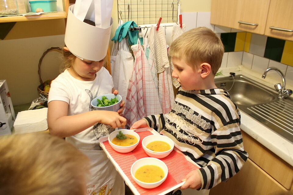An diesem Morgen sind 26 Kinder ganz besonders aufgeregt. Ihre Kochmützen haben sie schon auf den Kopf postiert und auch die Schürze sitzt perfekt. Schnell wird nochmal gerührt, damit nichts anbrennt. „Die Kinder haben heute für Ihre Eltern gekocht und zum Essen ins Kinderrestaurant eingeladen“, verrät Kita-Mitarbeiterin Swetlana Werner den Plan.
